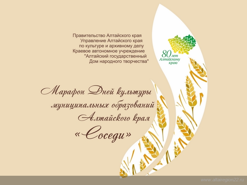 Творческий проект «Марафон Дней культуры муниципальных образований Алтайского края «Соседи» - это не просто обменные гастроли творческих коллективов из соседних районов. Близкое знакомство с историей и сегодняшним днем сопредельной территории обогащает и принимающую сторону, и гостей. В каждом муниципальном образовании, собираясь в гости к соседям, не просто отбирают лучшие номера местных творческих коллективов: программа, с которой выезжают на гастроли, максимально интересно и подробно, ярко и красочно рассказывает о районе или городе, представляет его историю, его настоящее и будущее. Поэтому соседям показывают не только замечательных танцоров и вокалистов – еще до начала концертной программы хозяева принимающей творческой площадки видят, чем живут в сопредельном районе.