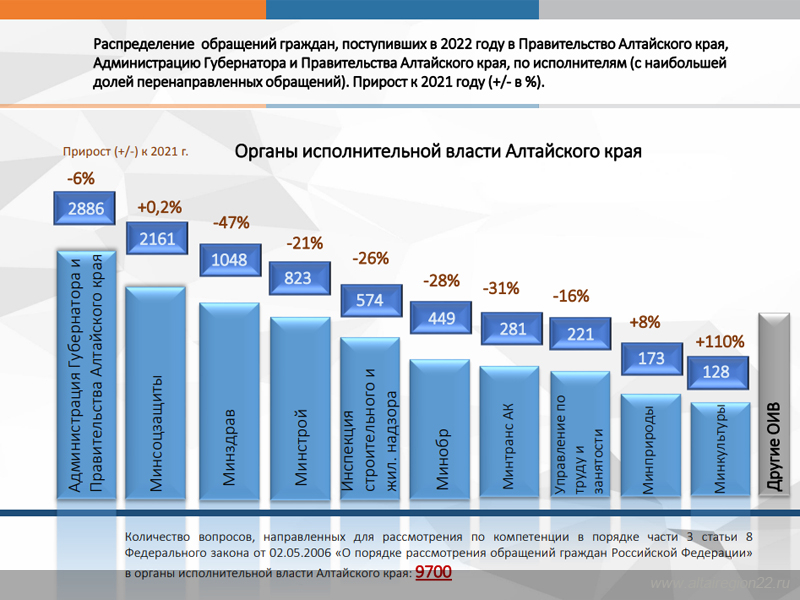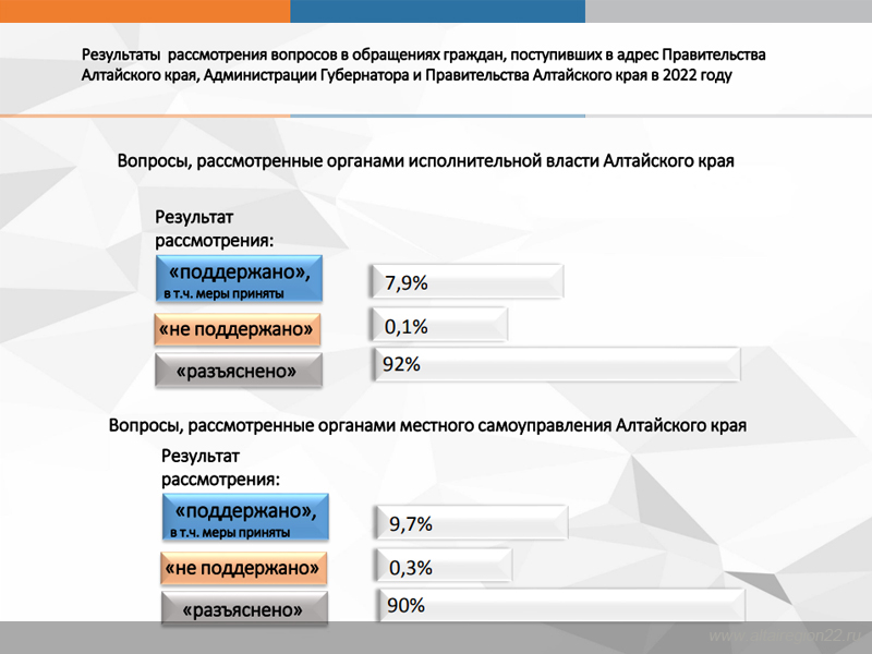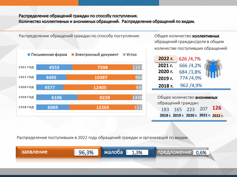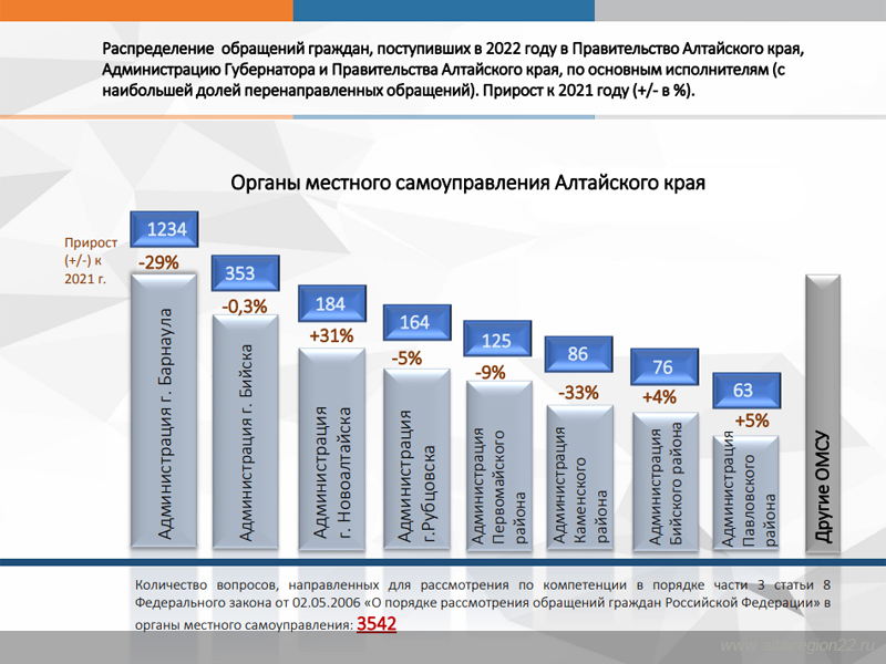 В 2022 году в Правительство Алтайского края, Администрацию Губернатора и Правительства Алтайского края поступило 13 350 обращений граждан и организаций, что на 16% меньше, чем в 2021 году. Количество обращений, перенаправленных в Правительство Алтайского края из Администрации Президента Российской Федерации для рассмотрения по компетенции, также сократилось на 18% по сравнению с предыдущим годом.