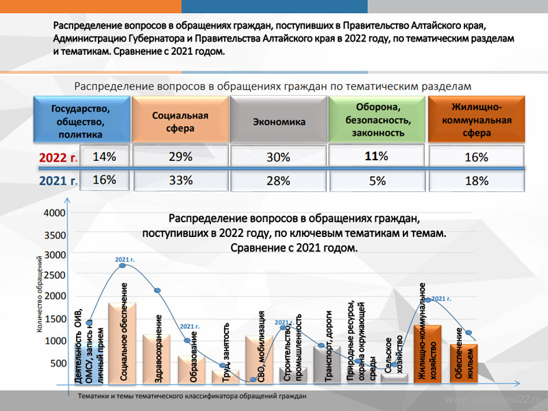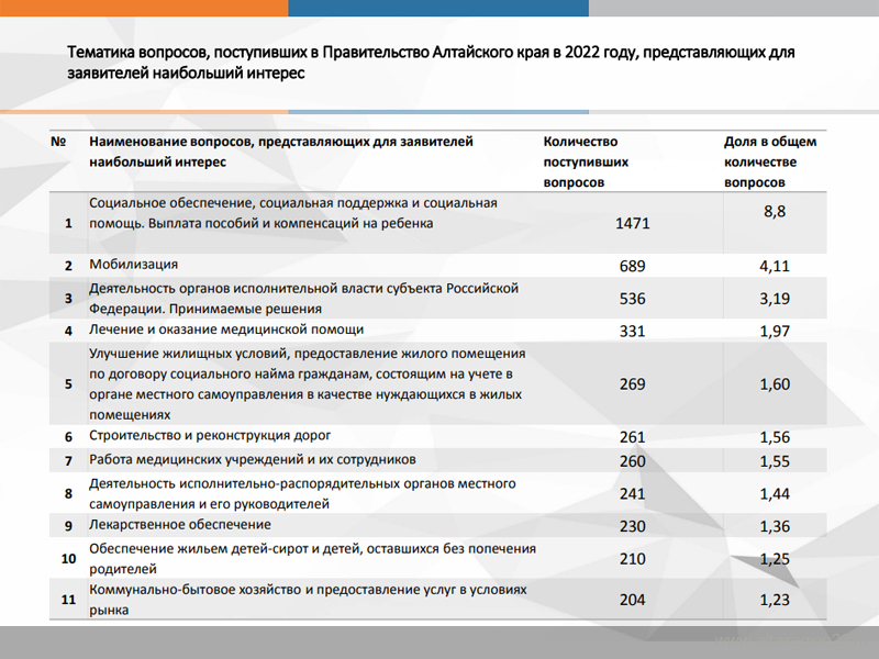 Из наиболее актуальных вопросов, поступивших в 2022 году в Правительство Алтайского края и представляющих для заявителей наибольший интерес, можно выделить следующие: социальное обеспечение, социальная поддержка и социальная помощь, выплата пособий и компенсаций на ребенка, мобилизация, деятельность органов исполнительной власти субъекта Российской Федерации, лечение и оказание медицинской помощи.