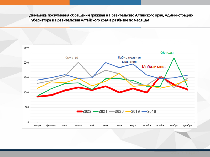 Наибольшее количество обращений, поступивших в Правительство Алтайского края в отчетном году, пришлось на период с октября по декабрь. Рост числа обращений связан с объявлением Президентом Российской Федерации частичной мобилизации.