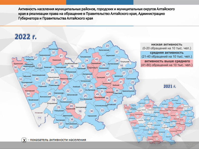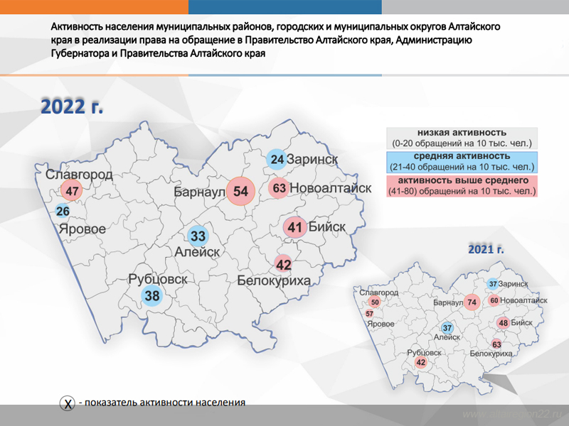 Наибольшая активность населения при обращении в Правительство Алтайского края отмечена в Новоалтайске, Барнауле, Славгороде, Белокурихе, Бийске, а также в Курьинском, Смоленском, Ключевском, Бурлинском, Петропавловском, Мамонтовском, Троицком, Первомайском, Зональном, Бийском, Каменском районах.