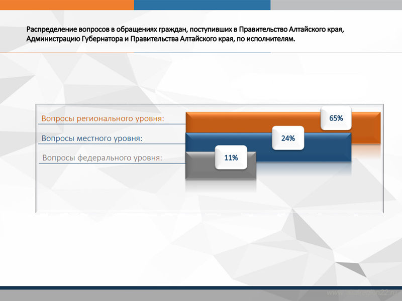 Среди вопросов, содержащихся в поступивших обращениях граждан, 65% находилось в компетенции исполнительной органов, 24% - органов местного самоуправления Алтайского края, 11% - территориальных федеральных органов исполнительной власти.