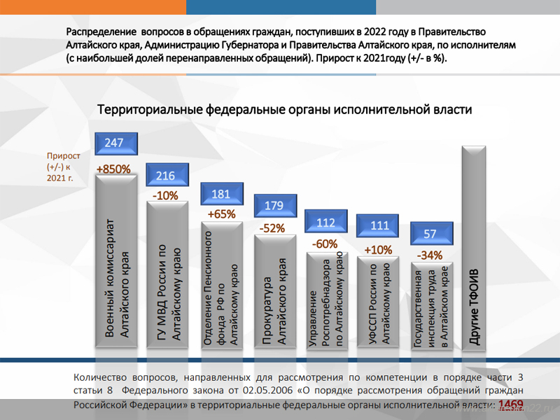 Наибольшее количество вопросов федерального уровня было направлено для рассмотрения по компетенции в Военный комиссариат Алтайского края, Главное управление МВД России по Алтайскому краю, прокуратуру Алтайского края, Отделение Пенсионного фонда Российской Федерации по Алтайскому краю, УФССП России по Алтайскому краю и Управление Роспотребнадзора по Алтайскому краю.