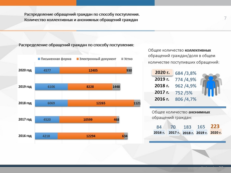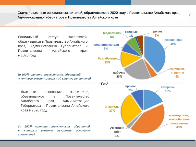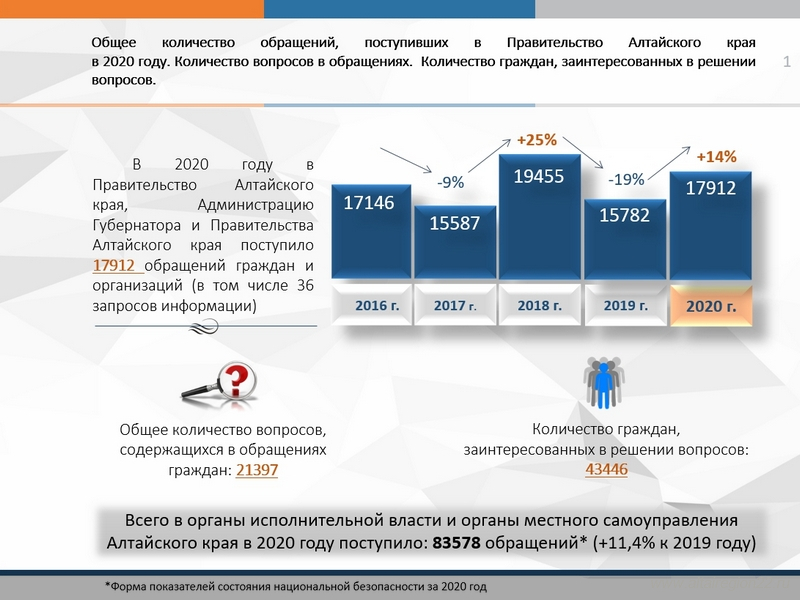 В 2020 году в Правительство Алтайского края, Администрацию Губернатора и Правительства Алтайского края поступило 17912 обращений граждан и организаций, что на 14% больше, чем в 2019 году. Количество обращений, перенаправленных в Правительство Алтайского края Администрацией Президента Российской Федерации для рассмотрения по компетенции, увеличилось на 59%.