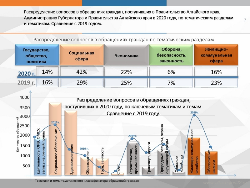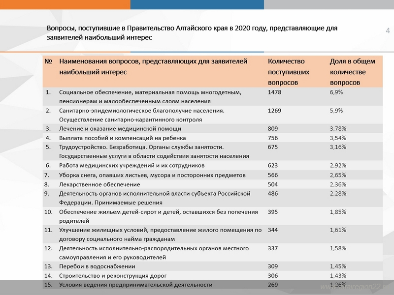 Из вопросов, поступивших в 2020 году в Правительство Алтайского края и представляющих для заявителей наибольший интерес, можно выделить следующие: социальное обеспечение и социальная помощь семьям, имеющим детей; санитарно-эпидемиологическое благополучие человека; лечение и оказание медицинской помощи; выплата пособий и компенсаций на ребенка; трудоустройство; работа медицинских учреждений и их сотрудников