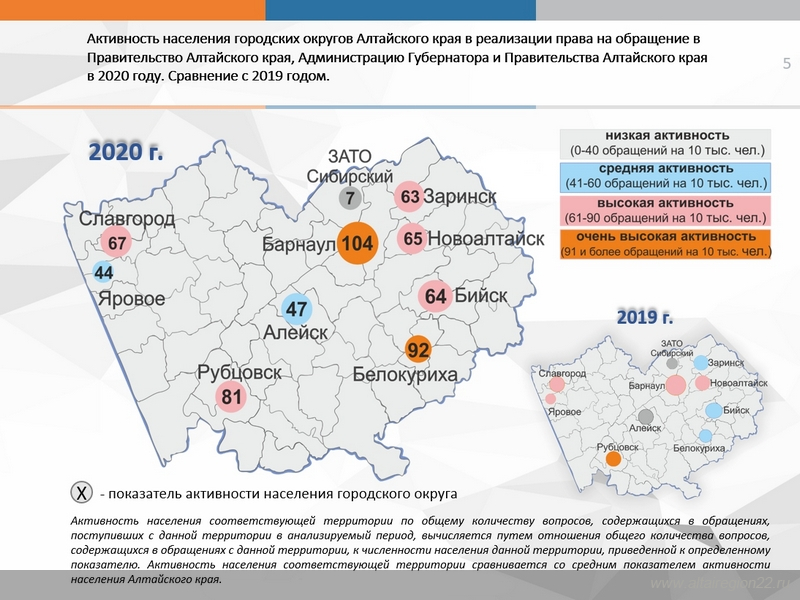 Наибольшая активность населения при обращении в Правительство Алтайского края отмечена в городах Барнауле, Белокурихе, Рубцовске, Калманском, Петропавловском, Первомайском, Третьяковском, Советском районах.