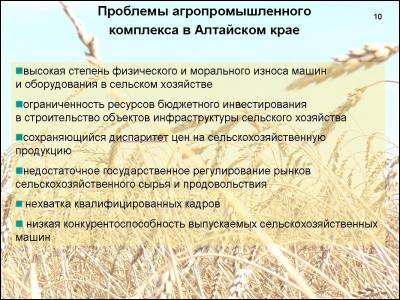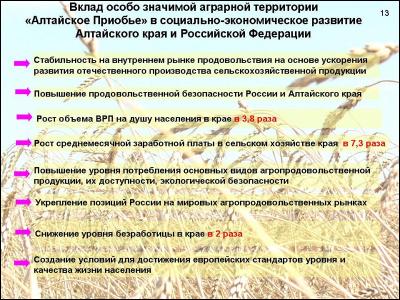 Особенно актуальным видится развитие такого региона, как Алтайский край, в свете дальнейшего освоения территории Сибири. По оценкам института региональной политики около 50% заявленных крупных инвестиционных проектов России будет реализовываться в Сибирском и Дальневосточном федеральных округах, для них потребуется создание порядка 600 тысяч новых рабочих мест, которые необходимо обеспечить, в том числе и продовольствием.