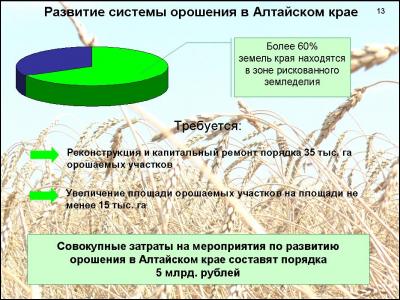 4 млн. гектаров пашни или более 60% от её наличия в крае находятся в зоне рискованного земледелия - недостаточного увлажнения, где количество осадков за вегетационный период составляет от 120 мм до 170 мм. На этой территории проживает половина сельского населения края. Одним из важнейших факторов обеспечения воспроизводства плодородия почв и развития сельскохозяйственного производства здесь является оросительная мелиорация, уровень развития которой в настоящее время не позволяет вести расширенное воспроизводство и становится серьезным ограничителем развития животноводства. Площадь орошаемых земель по состоянию на конец 1990 года составляла 200 тыс. га, по состоянию на начало 2008 года числится 75 тыс. мелиорированных земель, из которых 45 тыс. га не подлежат восстановлению. В настоящее время требуется реконструкция и капитальный ремонт порядка 35 тыс. га орошаемых участков, а также увеличение площади орошаемых участков в размере не менее 15 тыс. га. Совокупные затраты на данные мероприятия составляют порядка 5 млрд. рублей и без активного участия средств федерального бюджета их реализация крайне затруднительна.