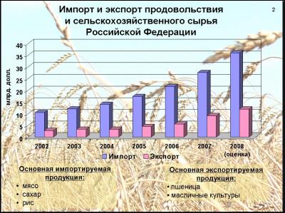Вместе с тем, на фоне очевидных положительных изменений в развитии сельского хозяйства, потребление основных продуктов питания в стране значительно ниже рекомендованных значений, ощутима разница между различными регионами страны, отдельными группами населения. Высокими темпами растет импорт сельскохозяйственного сырья и продовольствия, при этом его объемы по отдельным товарным группам, по мнению экспертов, превышают порог продовольственной безопасности страны - по оценкам Минэкономразвития России по итогам 2008 года объем импортной продукции составит 36 млрд. долларов США.