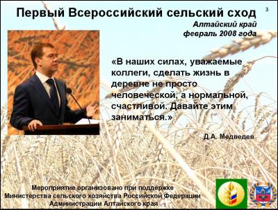 В рамках проходившего в 2008 году в Алтайском крае Всероссийского сельского схода с участием Дмитрия Анатольевича Медведева, по вопросу развития сельского хозяйства, Администрация Алтайского края выступила с инициативой придания отдельным субъектам РФ статуса особо значимых аграрных территорий.