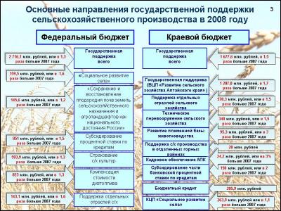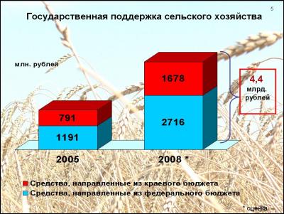 На территории края активно реализуются инвестиционные проекты, начатые в рамках приоритетного национального проекта «Развитие АПК», который придал мощный импульс развитию сельского хозяйства нашего края и, я полагаю, большинству регионов России. Благодаря поддержке федерального и краевого бюджетов объем финансирования сельского хозяйства вырос за 3 года в 2,2 раза, по итогам 2008 года эта сумма составит свыше 4,4 млрд. руб.