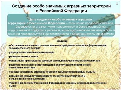 Целью создания таких территорий является повышение продовольственной безопасности страны путем приоритетной и более масштабной государственной поддержки регионов, играющих наиболее значимую роль в решении продовольственной безопасности в общенациональном формате.