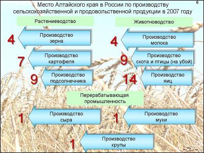 Алтайский край, который по праву называется житницей Сибири, является одним из крупнейших производителей сельскохозяйственной продукции и продуктов питания в России. По площади пашни и зернового клина Алтайский край занимает первое место в России, по поголовью крупного рогатого скота – четвертое. Алтайский край - во многом уникальный зерновой регион, по карте которого можно увидеть все аграрные зоны России: на севере края плантации льна-долгунца, как в Вологодской области, на юге - бахчевые, как в Астраханской области, в наших непростых условиях выведены сорта и отработаны технологии выращивания сахарной свеклы, подсолнечника, возделывания фруктовых деревьев и даже винограда.