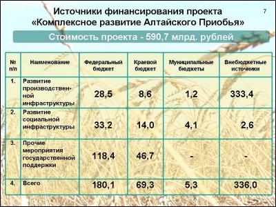 Цели и задачи проекта «Комплексное развитие Алтайского Приобья» соответствуют целям и задачам Концепции долгосрочного социально-экономического развития Российской Федерации на период до 2020 года, Доктринам продовольственной и национальной безопасности страны, Концепции устойчивого развития сельских территорий и направлены на создание на территории края зоны опережающего развития агропромышленной специализации.