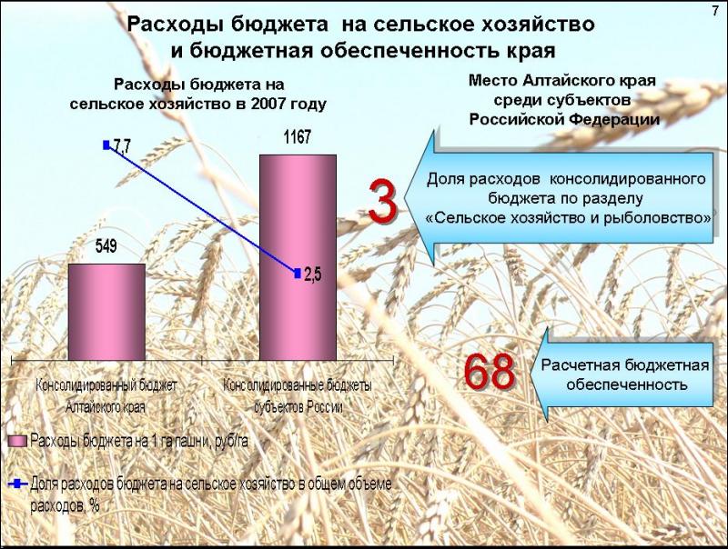 По итогам 2007 года доля расходов консолидированного бюджета Алтайского края на сельское хозяйство составила 7,7% от общих расходов консолидированного бюджета (для сравнения - доля расходов консолидированных бюджетов субъектов России на сельское хозяйство в среднем составляет 2,5%). По доле расходов бюджета на сельское хозяйство Алтайский край является одним из лидеров среди субъектов России, занимая 3 место.